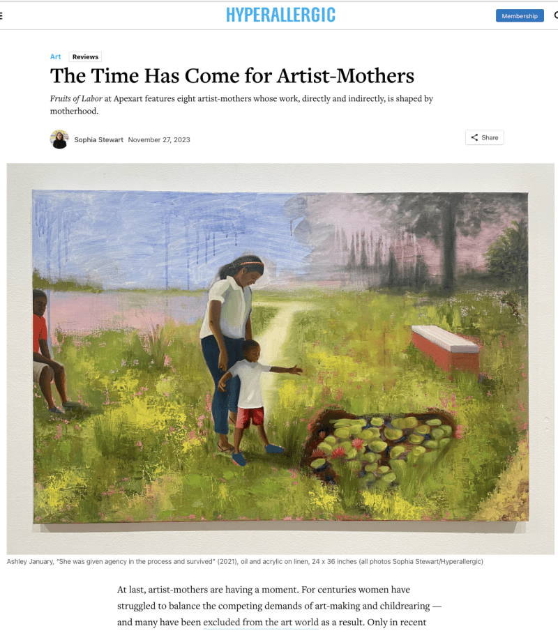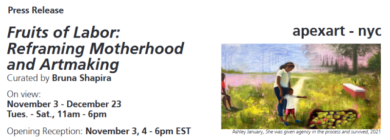 I participated in the group show, Fruits of Labor: Reframing Motherhood and Artmaking, with Apex Art in New York City. The show was curated by Bruna Shapira and my painting “She was given agency in the process and survived,” was included in the press release.